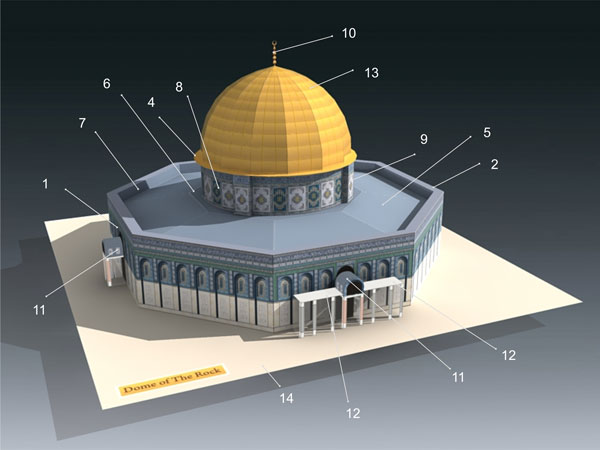 The Dome of the Rock, Masjid Qubbat As-Sakhrah, Hebrew : Kipat Hasela is an Islamic shrine which houses the Foundation Stone, the holiest spot in Judaism, and is a major landmark located on the Temple Mount in Jerusalem. It was completed in 691, making it the oldest extant Islamic building in the world. Its significance stems from the religious beliefs regarding the rock at its heart. The Dome of the Rock is located at the visual center of an ancient man-made platform known as the Temple Mount, which Muslims refer to as the "Noble Sanctuary". The platform, greatly enlarged under the rule of Herod the Great, is the site of the Second Jewish Temple which was destroyed during the Roman Siege of Jerusalem in 70 CE. In 637 CE, Jerusalem was conquered by the Rashidun Caliphate army during the Islamic invasion of the Byzantine Empire. [Wikipedia].