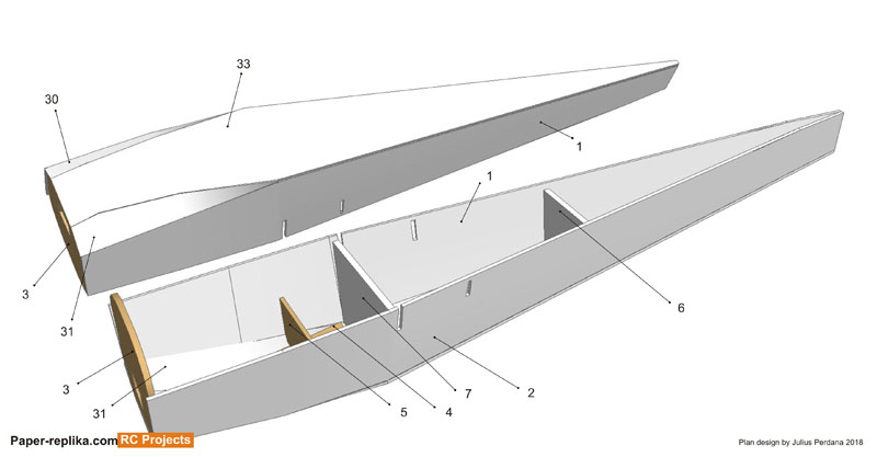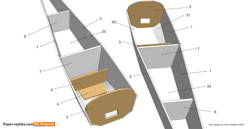 Assembly the fuselage with part 1,2 and 33. And then close the bottom with part 30 and 31. Place firewall (3) on the front and then middle former (7). Put rear former (6) 16.8 cm from middle former. Put part 4 on the floor in front off part 7 and then lock it with part 5 exactly in the middle of it.