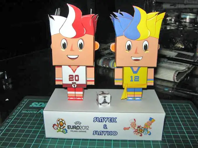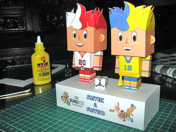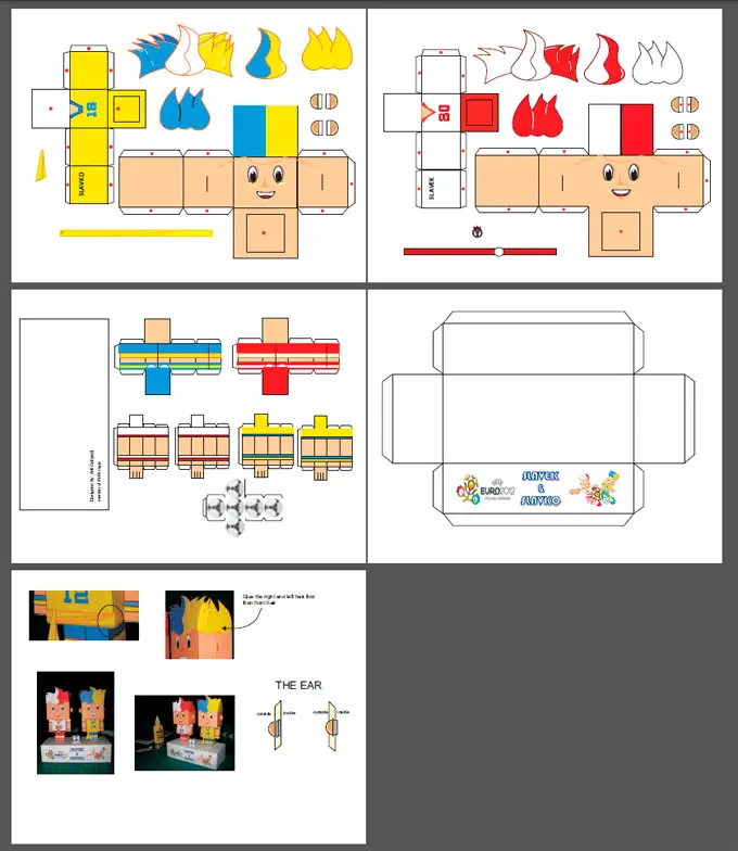 This cube figurine paper craft template was submitted by Arif Cahyadi a "PERI Jogja" member. When he searched for Euro mascot paper craft on the net, he only found Slavko then he thought about building it but he finally decided to make his own version both Slavek and Slavko. Arif said this is his first attempt on creating paper craft, so he choose cube form, the easiest one. The template is in PDF format, 4 pages template and 1 page assembly instructions. A display stage also included in this file. I say Arif is clearly inspired by cube paper crafts that are around on net.