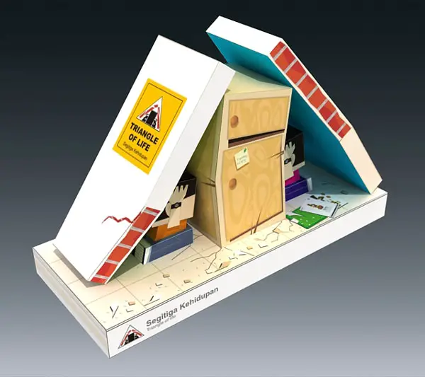 The Triangle of Life is a controversial theory advocated by Doug Copp about how to survive a major earthquake. It is intended to replace the traditional "drop, cover, and hold on" tactic. Copp recommends that, at the onset of a major earthquake, building occupants should seek shelter near solid items that will provide a protective space, a void or space that could prevent injury or permit survival in the event of a major structural failure -- a "pancake collapse". Such failures are rare in western communities where opponents argue the drop, cover and hold on tactic will prevent the vast majority of gravity-induced injuries that occur more frequently. [wikipedia]